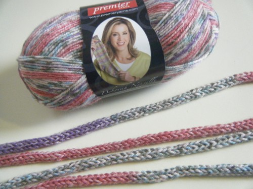 This month, I’m playing around with spool knitting. I’m using two different spool knitters…the more traditional French Knitting Bee, and the mechanical Embellish-Knit! Using a variety of yarns, here’s what I got: