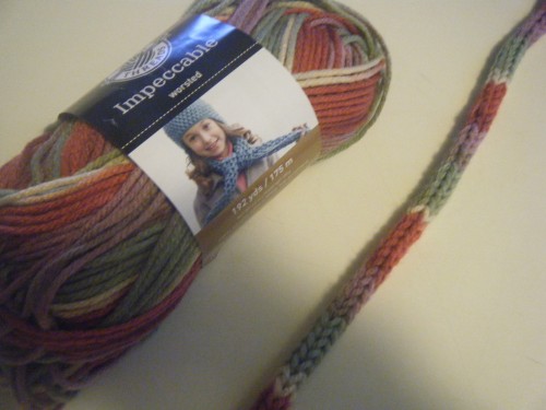 The Embellish-Knit! produces a more tightly knit tube than the French Knitting Bee. As I was photographing the instructions, I noticed that you are not to use a standard 4-ply worsted weight or heavier yarn in the Embellish-Knit! or you can damage your machine. Oops. I did that. Fortunately, I didn’t damage my machine.