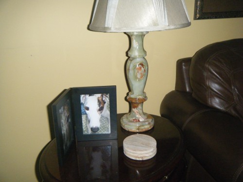 Paloma was not the calm Greyhound that I anticipated. Paloma was a big, wild girl, and my husband and I fell desperately in love with her. Paloma was not cat-friendly. We had to work with her A LOT on that. Paloma was a jumper, so coming into our home was tricky. If Paloma got to you, it was like getting hit in the chest with a sledgehammer.  Paloma would use our family room as a race track…she’d use the back of the couch as a spring board. Other than those few eccentricities, Paloma was a sweet, loving, joyful girl. She was a good girl too. She really wanted to please, she just got a little excited some times. Her absolute favorite activity was chasing a laser light. Every evening my husband would take her into the backyard and she would run laps, chasing that crazy light.